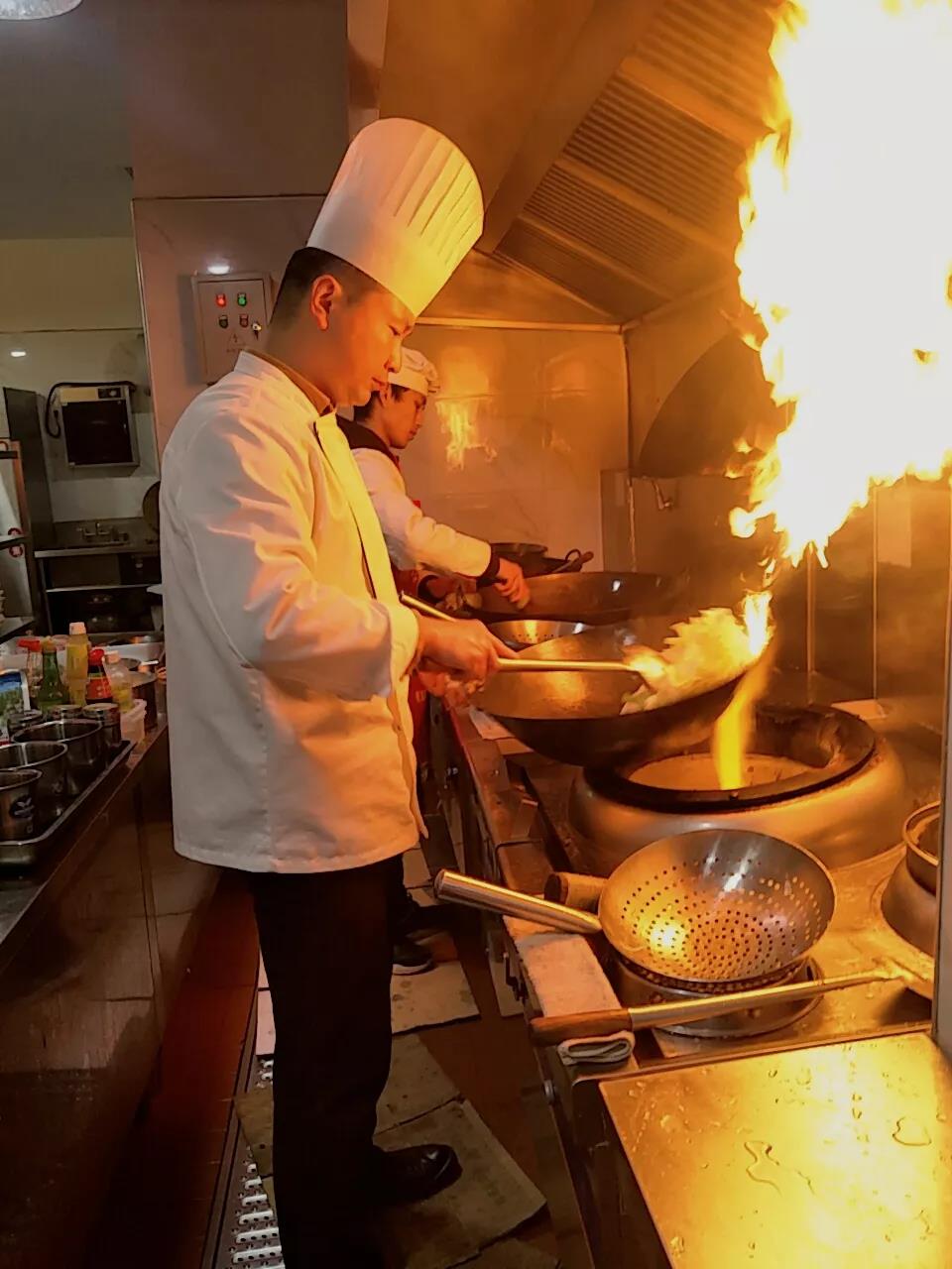 每天清晨,岳明辉带领团队完成预订菜品搭配,做好食材的挑选和定量分装。午餐、晚餐时刻,岳明辉开启“小马达”模式,飞速旋转在厨房中,一“启动”就是四五个钟头。纵使冬季天气寒冷,他单穿一件厨师服,也能忙碌到汗如雨下、衣服浸透。