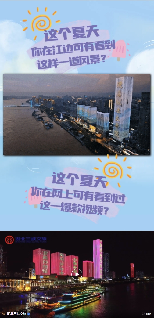 这个夏天,漫步在夏季纳凉人流量最集中的滨江路段,最“City”的就是在伍家岗万达、宜昌国际广场、福江铭座三座地标建筑上循环播放的景区宣传语。