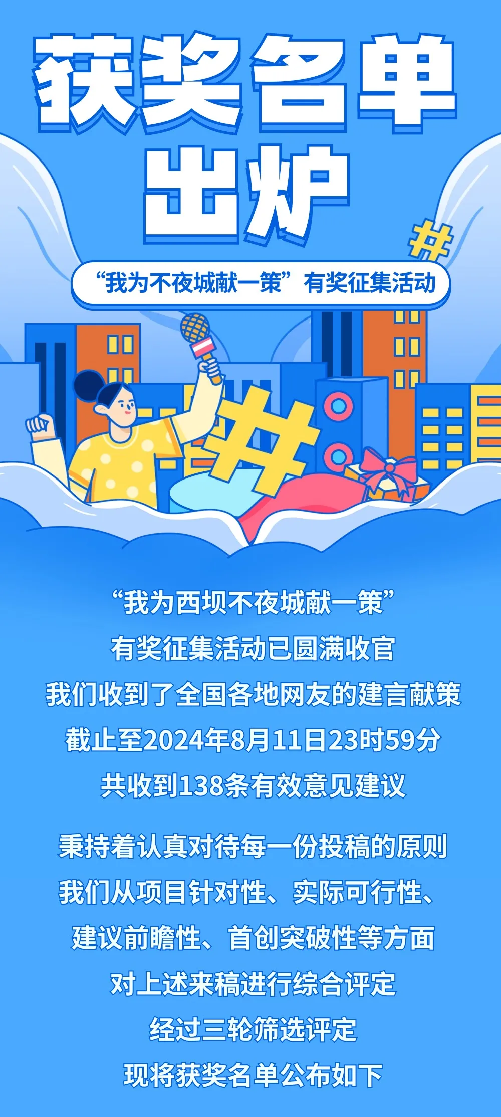 1.以上现金奖金均为含税金额;2.请上述获奖者于9月8日前,在西坝不夜城微信公众号后台留言,将您的“姓名+身份证+银行卡号+开户银行”发送给工作人员,以便奖金发放。我们将于9月内完成奖金发放,逾期未联系者视为自动放弃奖金。