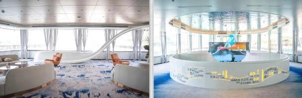游轮内部装饰采用多元设计风格,其部分流线型结构灵感来源于长江的自然风光,创造出自然与艺术的和谐共鸣。在功能设计与美学表达之间取得了平衡,为宾客打造了一个内外和谐、风格独特、质感统一的高端舒适水上活动空间。